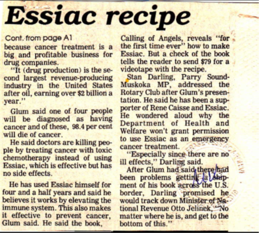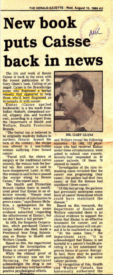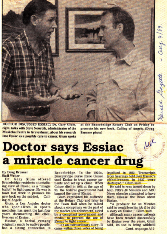 “天使的呼召”出版再度帶動Essiac報導風潮(1989) CALLING OF AN ANGEL 一書初版封面 醫生作者新書關於Essiac 洛杉磯醫生Gary Glum作者新書關於Essiac 簽書會:Gary Glum醫生為一位女士在”CALLING OF AN ANGEL”新書上簽名。 醫生說:Essiac是一個奇蹟的癌症藥物 (續上):Essiac配方 新書讓Rene Caisse重回新聞焦點 Essiac是值得的 2018再版封面