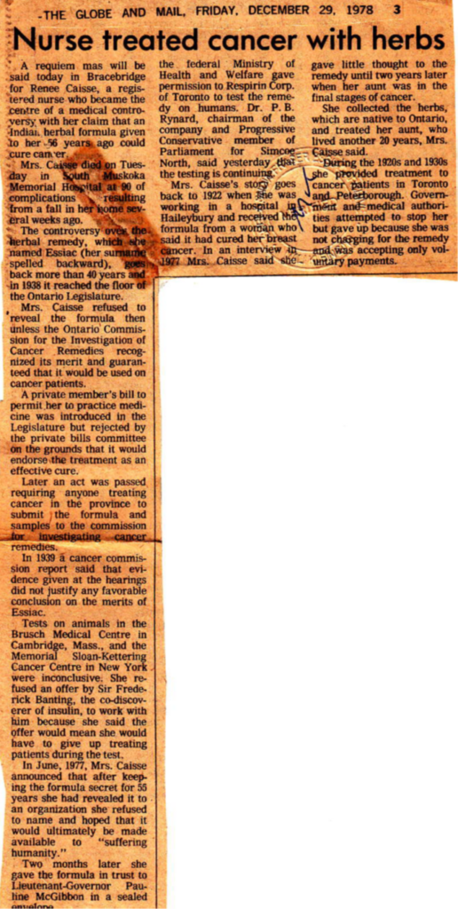 本世紀的女士_Rene Caisse致力於減少人類的痛苦,超過50年的奮戰隨著她的過世而結束。